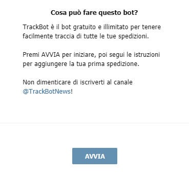 TrackBot è il bot gratuito che ti permette di tenere traccia di tutte le tue spedizioni su Telegram. Ha visto una crescita costante di utenti e spedizioni ed ora gestisce quasi 50 corrieri. Puoi avviarlo qui https://telegram.me/TrackBot o cercare nella lista contatti “Trackbot” e poi premere AVVIA